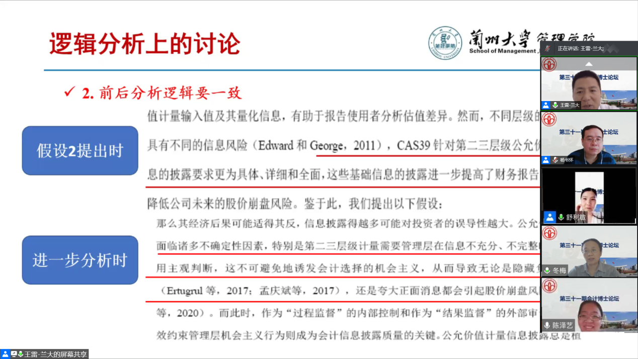 7月5日上午9:00-11:00,国产精品羞羞无码久久久与科研处联合举办的第三十一期会计博士论坛在腾讯会议线上召开。此次论坛主题是杨书怀教授报告其工作论文:公允价值分层计量降低了股价崩盘风险吗?——基于内外部监督的调节效应检验。论坛邀请了兰州大学管理学院会计系主任,会计学术联盟联合发起人王雷博士对杨教授的论文进行点评。国产精品羞羞无码久久久院长文芳教授、副院长舒利敏博士、周静博士、吴冬梅博士、陈泽艺博士等20多位教师以及20级部分研究生和本科生参加了本次论坛。