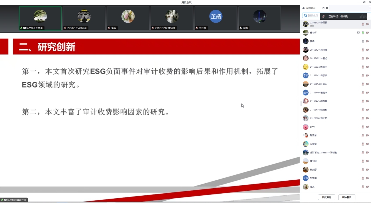 最后,李亚超博士作了题为《ESG负面事件会影响审计收费吗?——来自我国上市公司的经验证据》的报告。研究发现,ESG负面事件显著提升了审计收费,社会责任和公司治理类处罚比环境类处罚对于审计费用的提升作用更显著。在交流环节,杨书怀教授中介变量度量、完善理论分析等与李博士进行了深入的探讨。