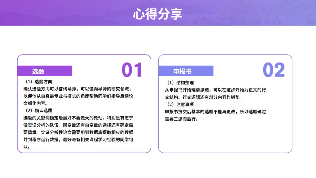 在李亚超老师为我们分享完比赛经验与注意事项后,主持人为我们宣读了由于时间问题无法来到现场参与活动的罗学姐的心得分享,她是上一届财会杯的获奖者。她向我们分享了自己参赛获奖心得。她所分享的或许都是自己在参赛时所碰到的问题和麻烦,大到在选题上的确定,小到对于申报书、论文提交的格式等等,让现场许多同学们收获颇丰。