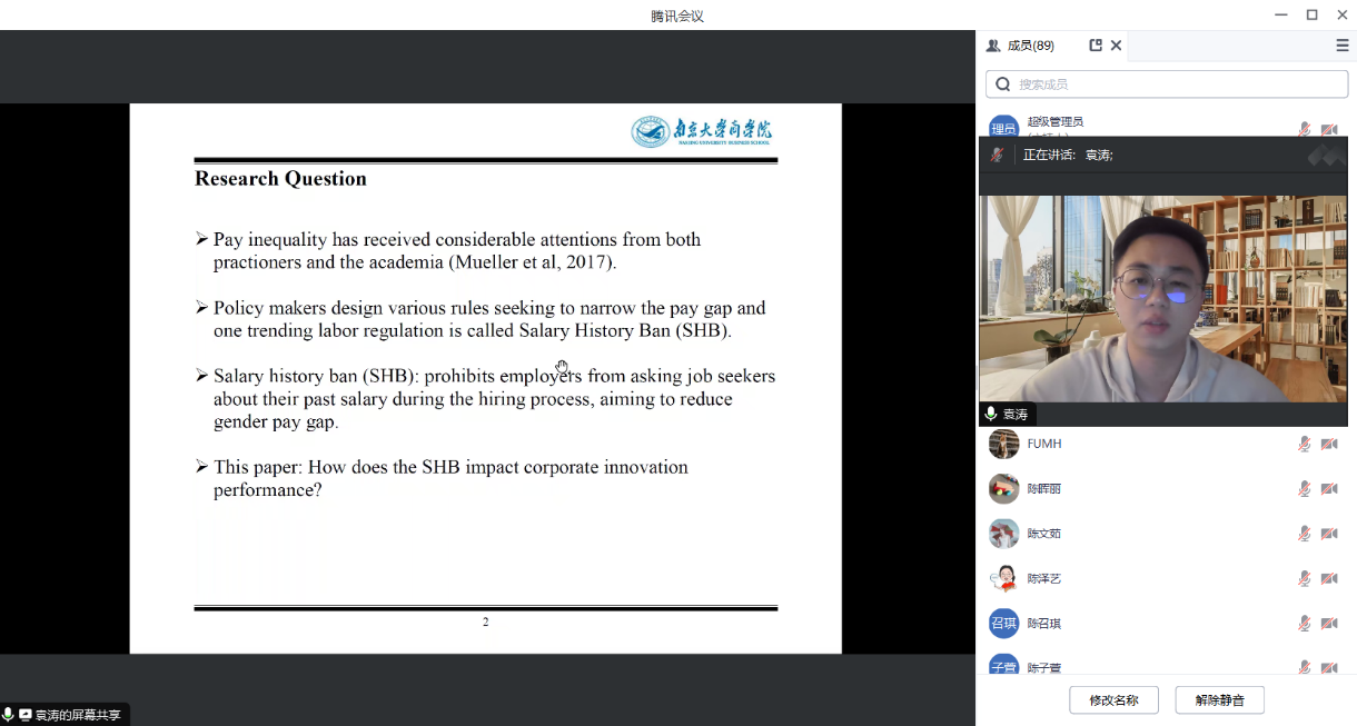 在论文报告环节,袁涛老师首先介绍了美国的薪酬历史禁令(Salary History Ban)及其相关研究,在此基础上探讨薪酬历史禁令的出台对企业创新的影响。研究发现,薪酬历史禁令的出台降低了企业创新水平。进一步的机制分析表明,薪酬历史禁令在减少性别工资差距的同时降低了男性员工工作的积极性,对企业创新活动产生负面影响。此外,薪酬历史禁令的出台可能会加剧就业市场的信息不对称,导致企业在招聘过程中出现 “逆向选择”,降低研发人员的招聘质量。在交流环节,我院师生就论文的异质性检验、结论在国内的适用性以及中介效应方法的使用等学术问题与袁涛老师进行了深入的探讨。